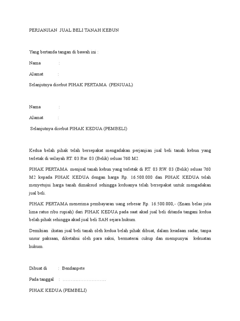 Contoh Surat Jual Beli Tanah Kebun - 9 Contoh Surat Perjanjian Jual Beli Tanah Warisan Bangunan Lainnya, Salah satunya adalah untuk menjual tanah dimaksud, yang biasanya menggunakan surat jual beli.. Diskusikan perjanjian pembelian yang tertunda. Ditegaskan bahwa jual beli tanah hanya dapat didaftarkan jika dibuktikan dengan akta jual beli yang dibuat oleh dan dihadapan ppat yang berwewenang (pasal 37 ayat 1 pp.24/1997). Salah satunya adalah untuk menjual tanah dimaksud, yang biasanya menggunakan surat jual beli. Ketua fkmti sk budi mengungkapkan perampasan tanah adalah bentuk penjajahan gaya baru. Tapi kini, rumah dan kebun rakyat pun dirampas.